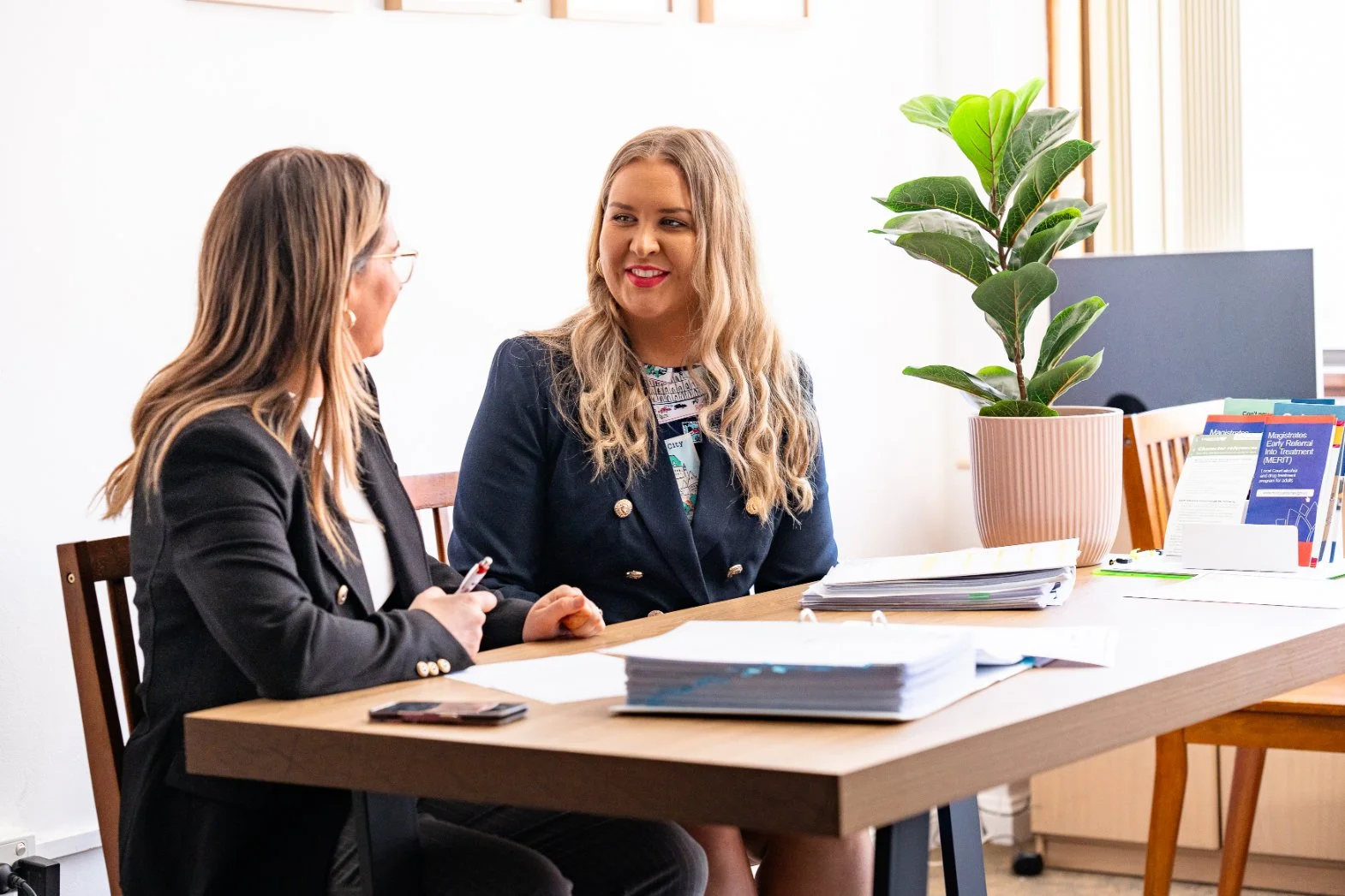 Two women having a discussion in an office, one standing and leaning over a seated woman holding papers and a pen, with a stack of files on the table, and a potted plant in the background.